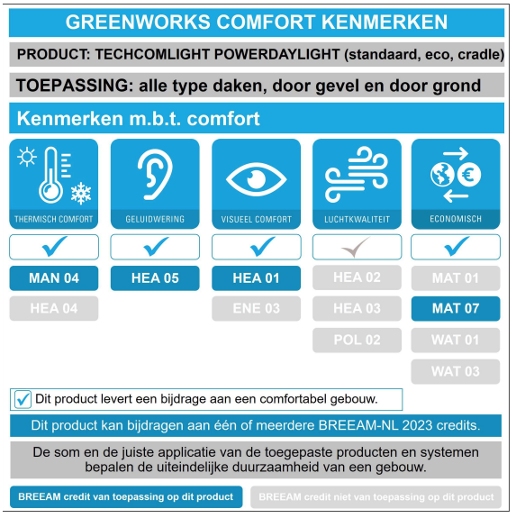 Techcomlight heeft Powerdaylight recent opnieuw gelabeld en voorzien van een geüpdatet productblad, zodat de productinformatie beter aansluit bij de uitgangspunten van Greenworks en bij erkende rekeninstrumenten zoals GPR Gebouw en BREEAM-NL.